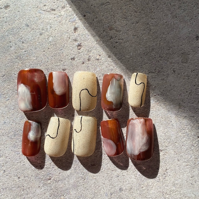 くすみブラウンに砂ジェルのうねうねデザインを施しています。10本全てこちらのデザインとなります。 ●【購入前に必ずお読み下さい】を必ずお読み下さい。 ●備考欄に必ずチップサイズをご記載ください。