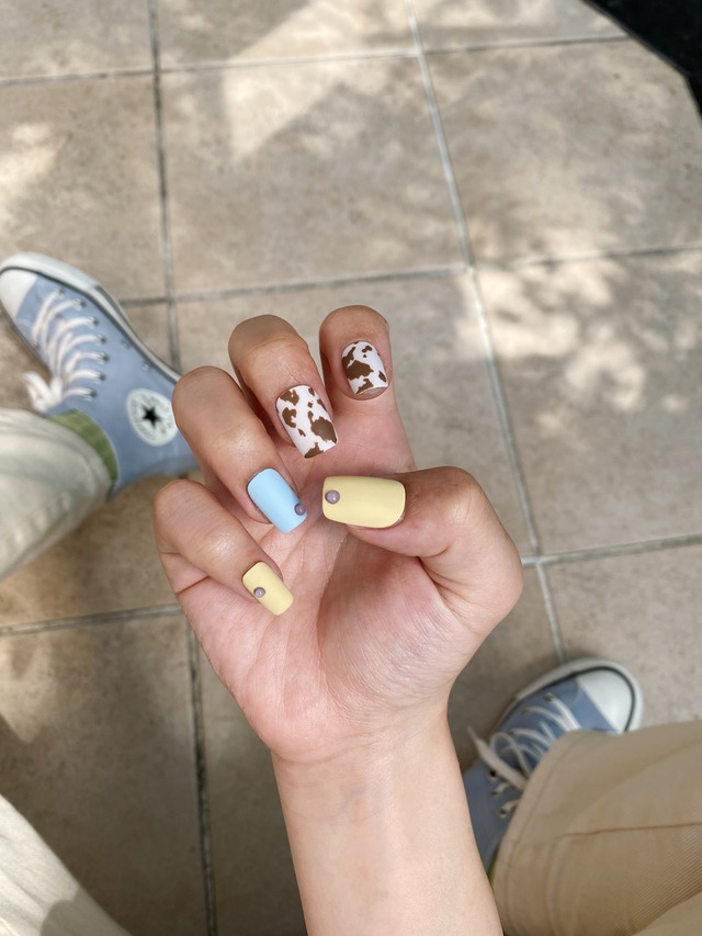人気の牛柄、春カラーアレンジです。こちらはマット仕上げです。 ●【購入前に必ずお読み下さい】を必ずお読み下さい。 ●備考欄に必ずチップサイズをご記載ください。 ●マット部分は艶トップに変更可能です。ご希望の方は備考欄に【艶トップ希望】とご記載ください。