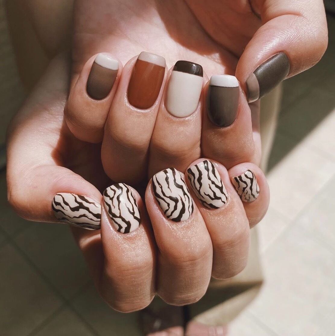 画像上デザインは、様々なブラウンを組み合わせてフレンチにしました。上下ランダムに、マット・ツヤトップで仕上げています。