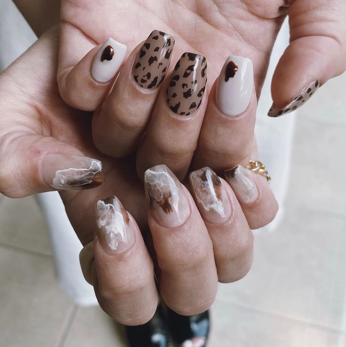 レオパード柄とニュアンスデザインをランダムにデザインしました。ホワイトに見える指はアイボリーベースに、オレンジブラウン系のジェルをぷっくり乗せたです。