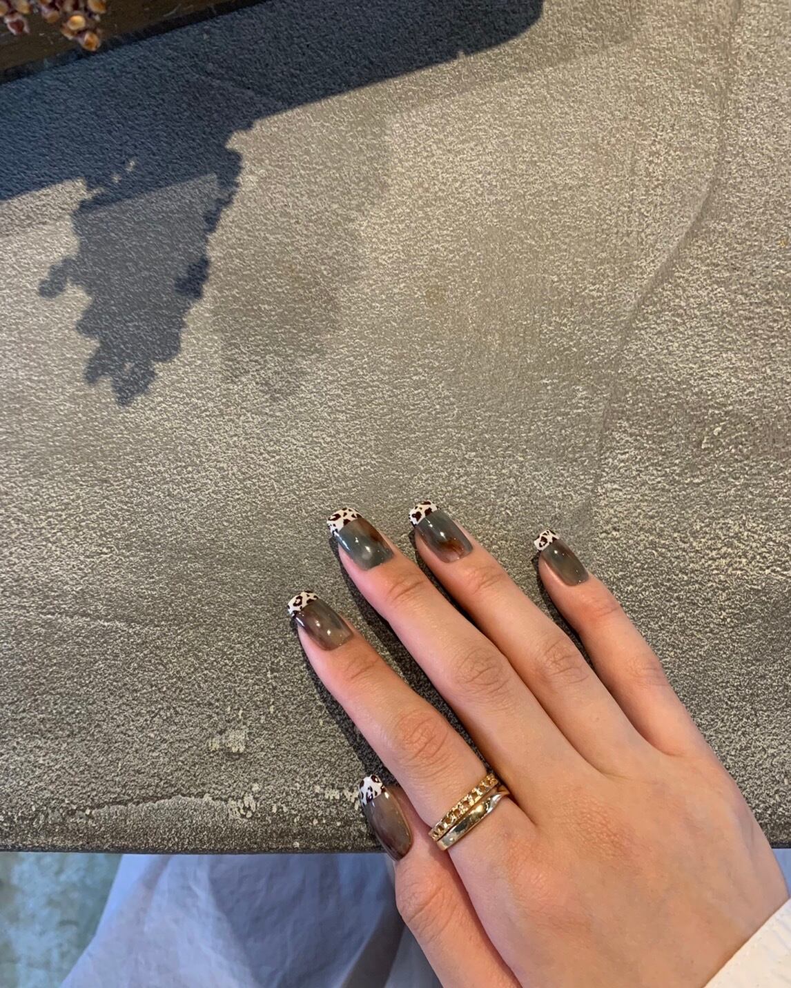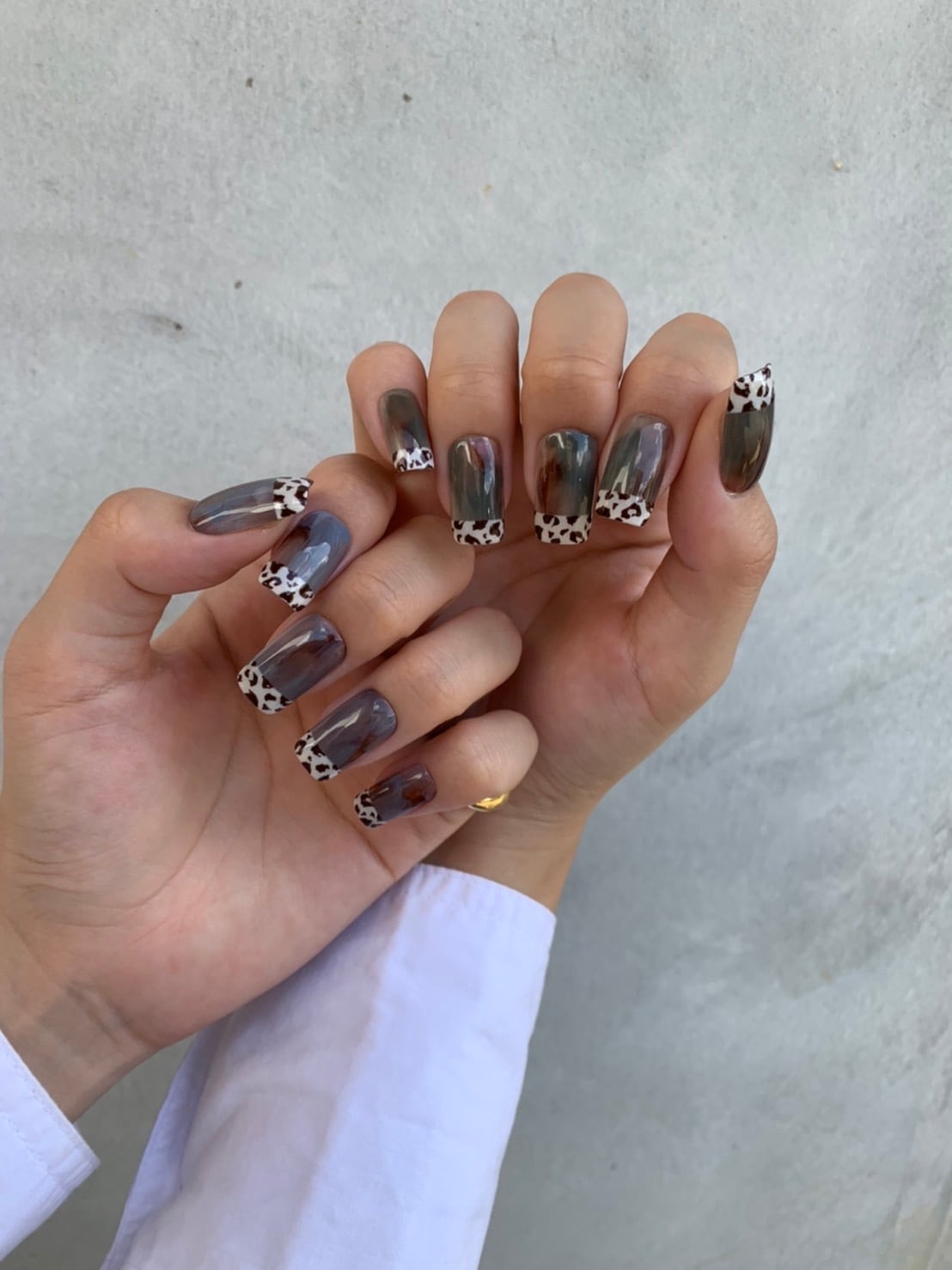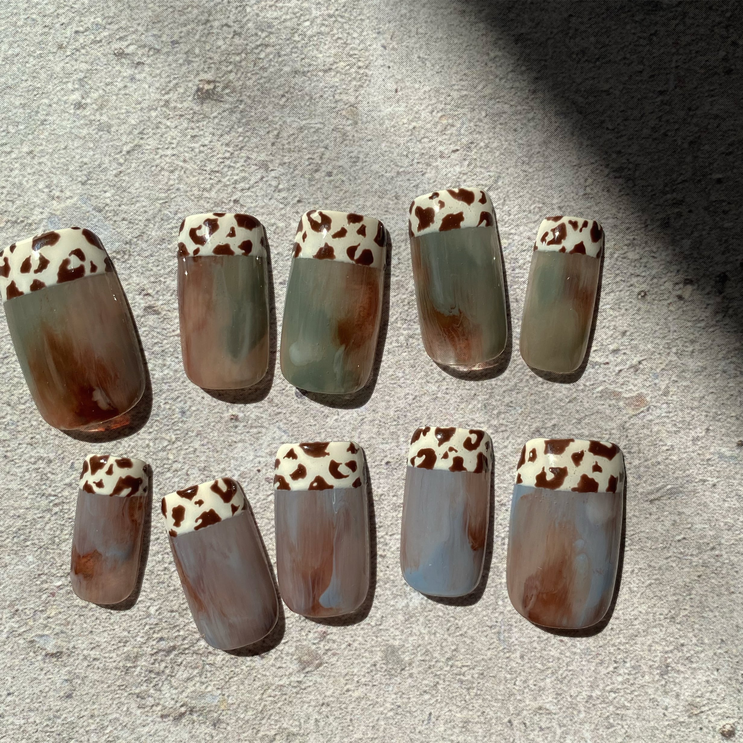 green と blue のニュアンス柄にレオパードのアクセントの効いたデザインです。